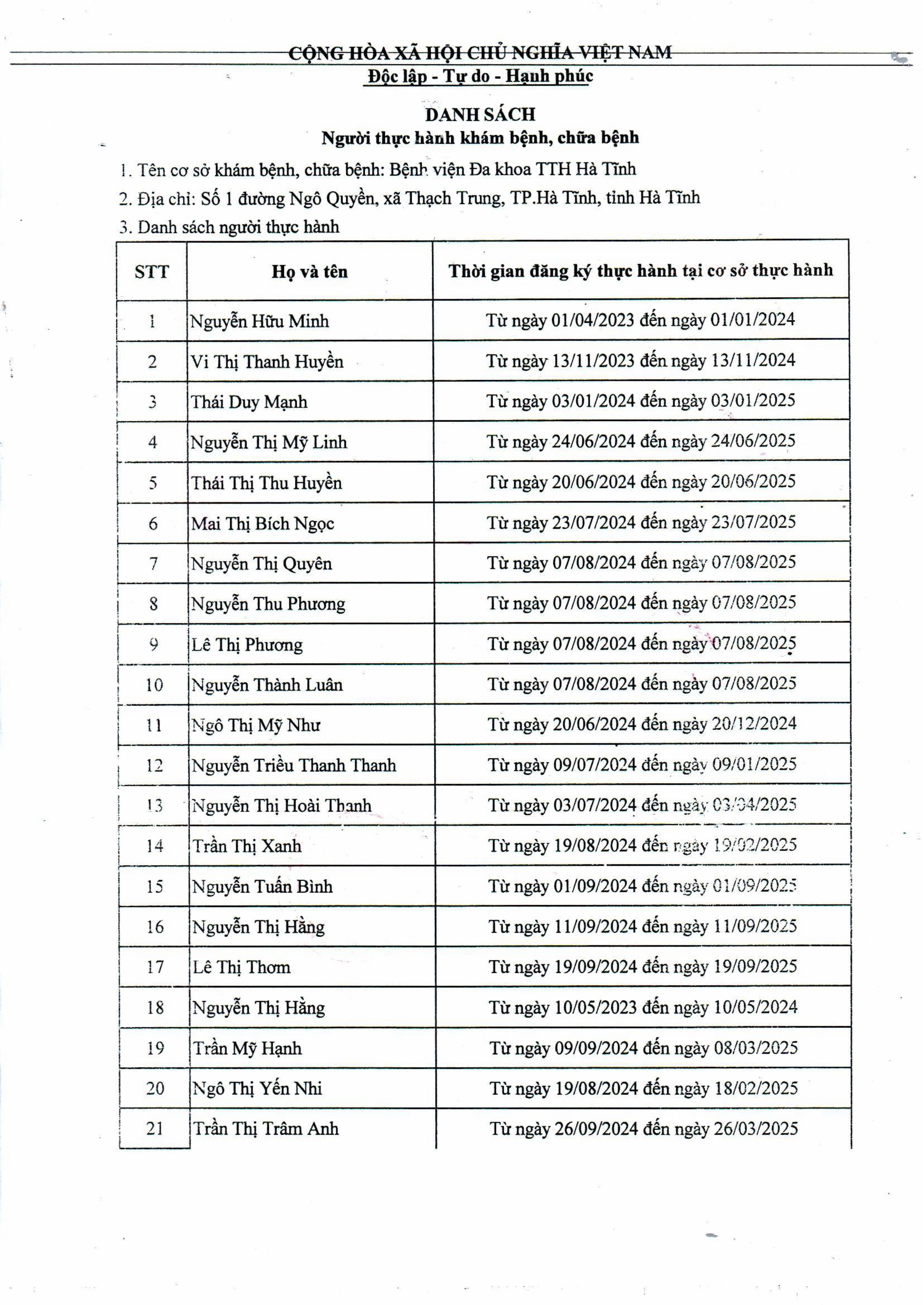 Tên cơ sở khám bệnh: Bệnh viện đa khoa TTH Hà Tĩnh