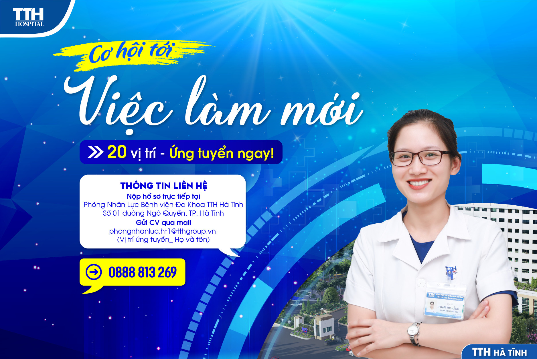 Để tăng cường đội ngũ nhân lực nhằm đáp ứng nhu cầu ngày càng lớn về dịch vụ y tế, bảo đảm chất lượng dịch vụ hoàn hảo nhất, Bệnh viện Đa khoa TTH Hà Tĩnh tuyển dụng các vị trí: