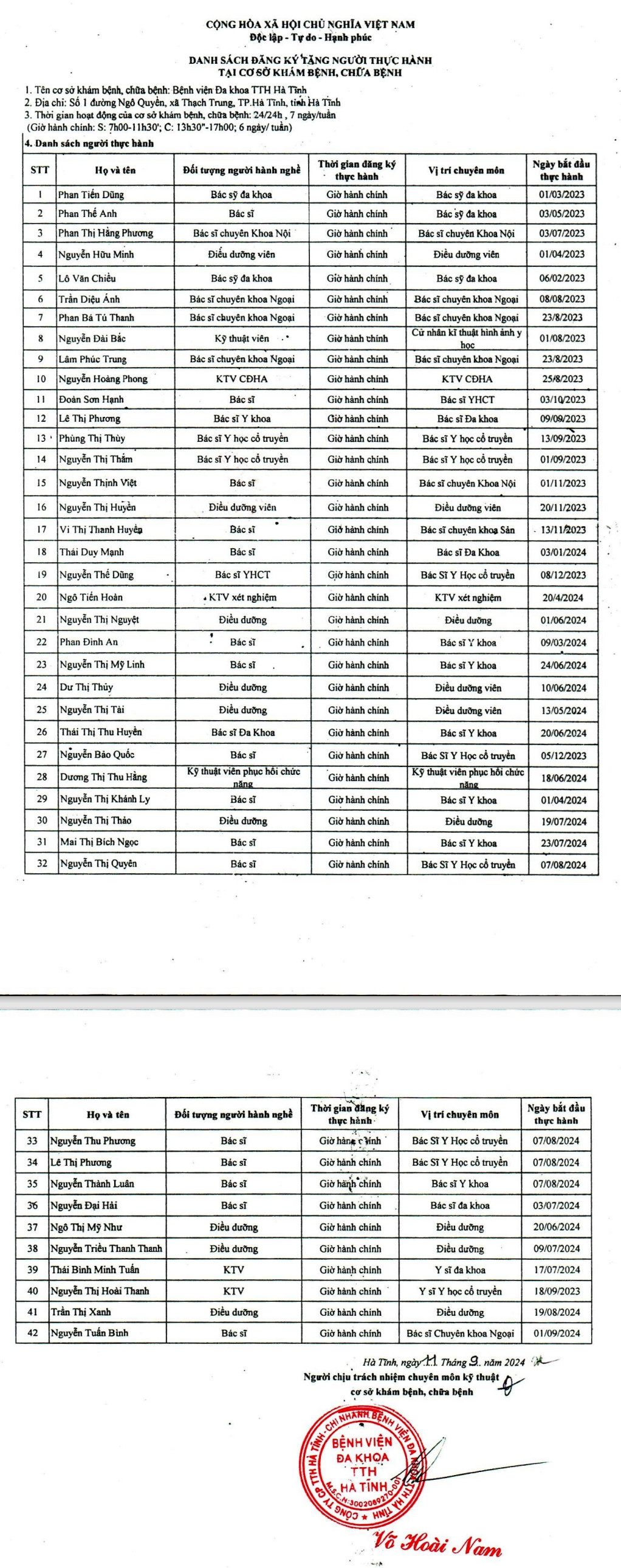 Danh sách đăng ký tăng người thực hành tại cơ sở khám bệnh, chữa bệnh tính đến ngày 12/009