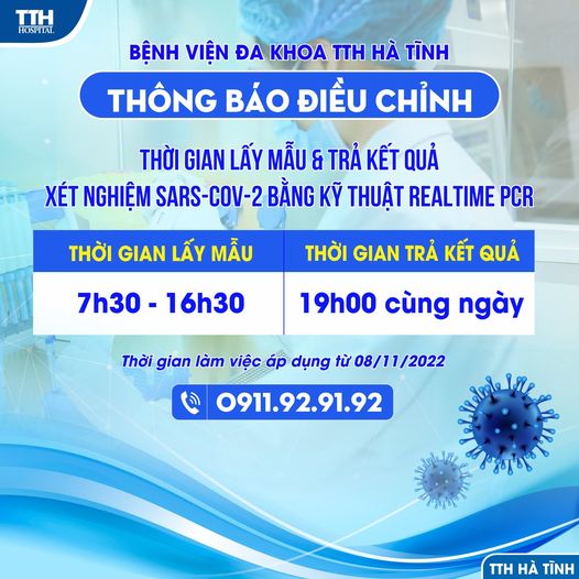 Nhằm đáp ứng kịp thời nhu cầu xét nghiệm COVID-19 của khách hàng, đồng thời giúp khách hàng chủ động thời gian nhận kết quả xét nghiệm, Khoa Xét nghiệm- Giải Phẫu Bệnh Bệnh viện Đa khoa TTH Hà Tĩnh thông báo điều chỉnh thời gian lấy mẫu và trả kết quả xét nghiệm Sars-Cov-2 bằng kỹ thuật Realtime PCR như sau:
