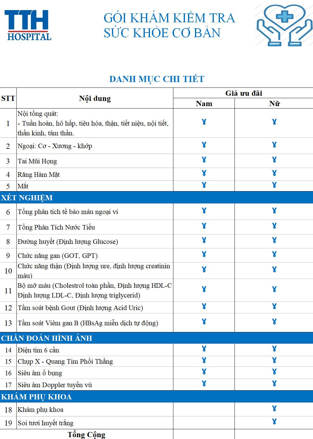 Bệnh Viện Đa Khoa TTH Hà Tĩnh kính gửi đến Quý khách hàng danh mục chi tiết gói khám kiểm tra sức khỏe định kỳ theo thông tư 14 như sau: