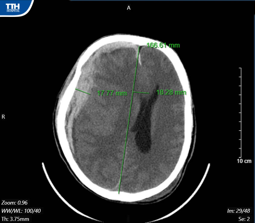 Bệnh nhân V vào viện trong tình trạng hôn mê, glasgow 6 điểm, liệt nửa người trái. Kết quả chụp cắt lớp vi tính phát hiện tụ máu dưới màng cứng bán cầu phải cấp tính độ dày 18 mm gây đè đẩy đường giữa 18 mm.