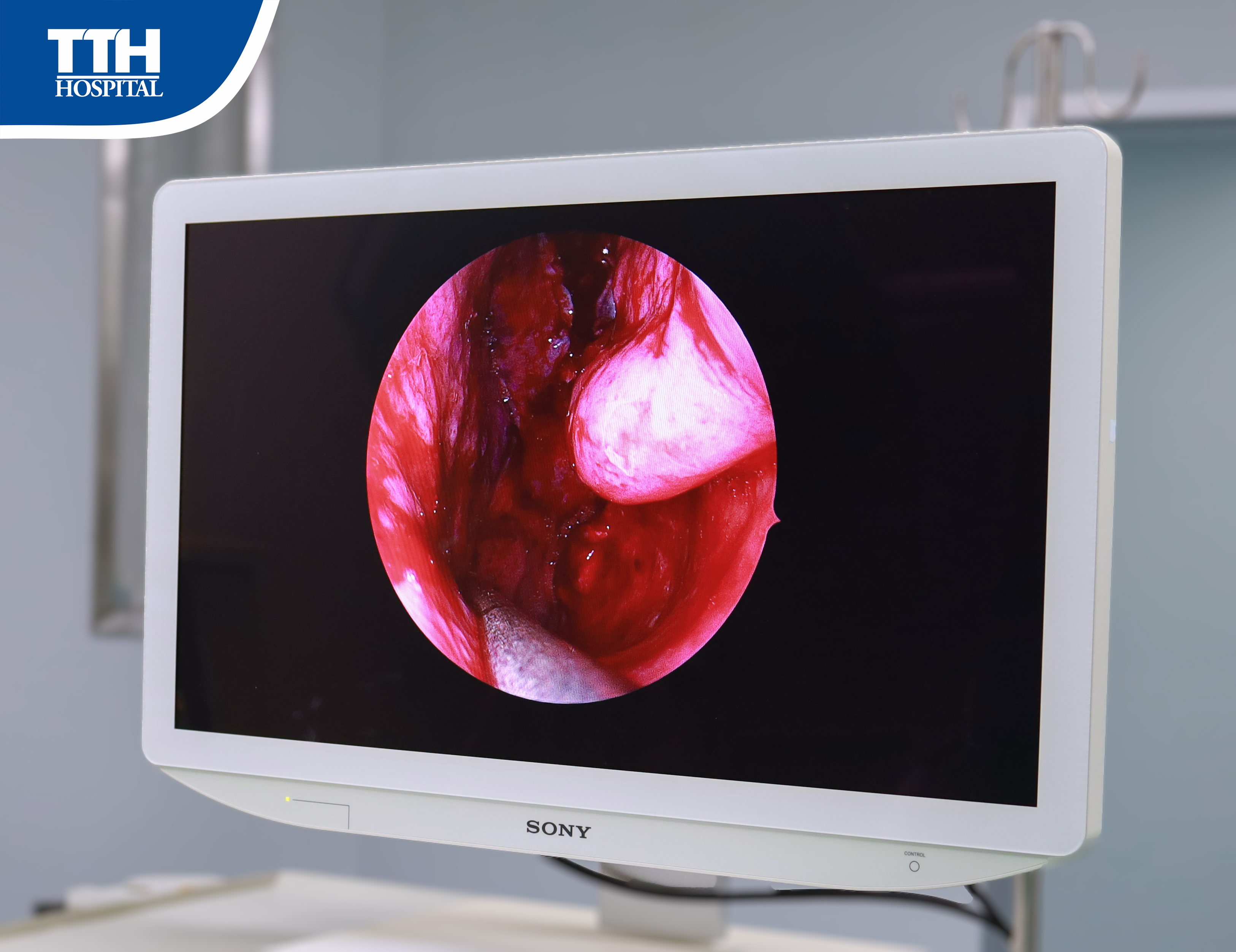 🔰 Tại Bệnh viện Đa khoa TTH, sau khi được thăm khám lâm sàng, nội soi mũi và chụp CT Scan, các bác sĩ xác định bệnh nhân có khối polyp mũi kích thước lớn, kèm theo tắc nghẽn nhiều xoang (sàng - hàm - trán - bướm) do viêm xoang mạn tính. Để giải quyết triệt để tình trạng này, bác sĩ đã chỉ định phẫu thuật nội soi mở các xoang sàng hàm trán bướm và cắt bỏ polyp mũi.