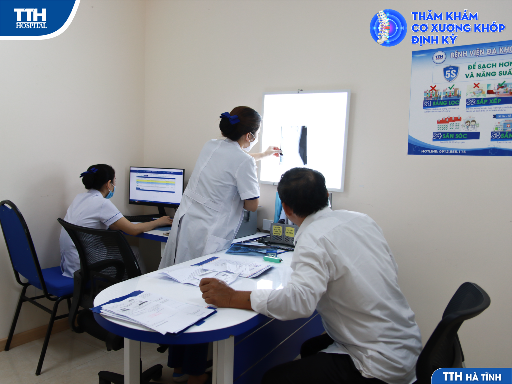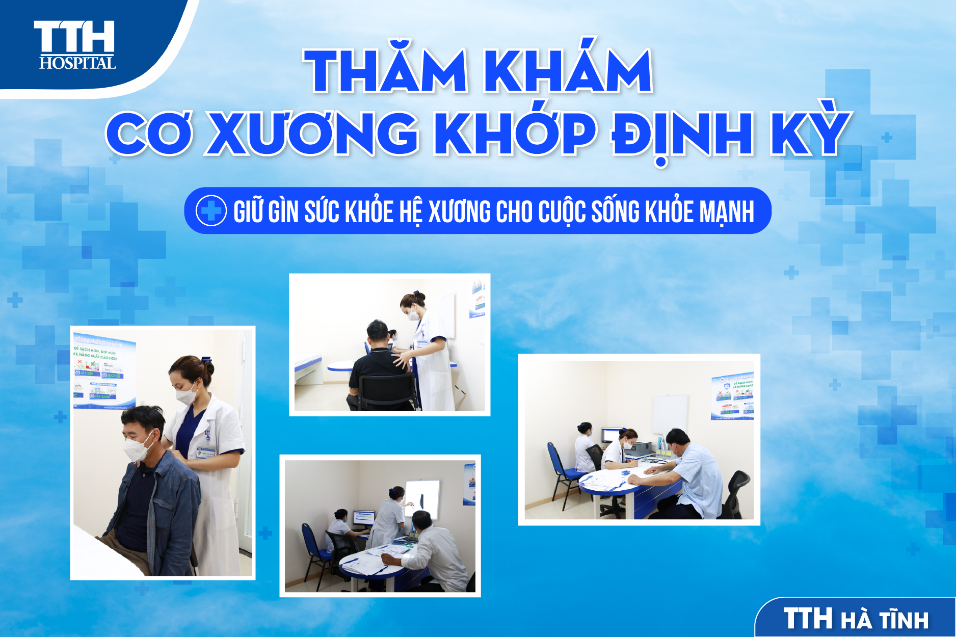 Thấu hiểu được điều đó, Bệnh viện Đa khoa TTH Hà Tĩnh đã thành lập phòng khám Nội Cơ xương khớp nhằm đáp ứng nhu cầu thăm khám, tầm soát và điều trị chuyên sâu các bệnh lý chuyên ngành xương khớp cho khách hàng như: viêm khớp, thoái hóa cột sống, thoái hóa khớp gối, loãng xương, viêm khớp dạng thấp, gút, viêm khớp nhiễm trùng, hội chứng cánh tay cổ, thoát vị đĩa đệm…