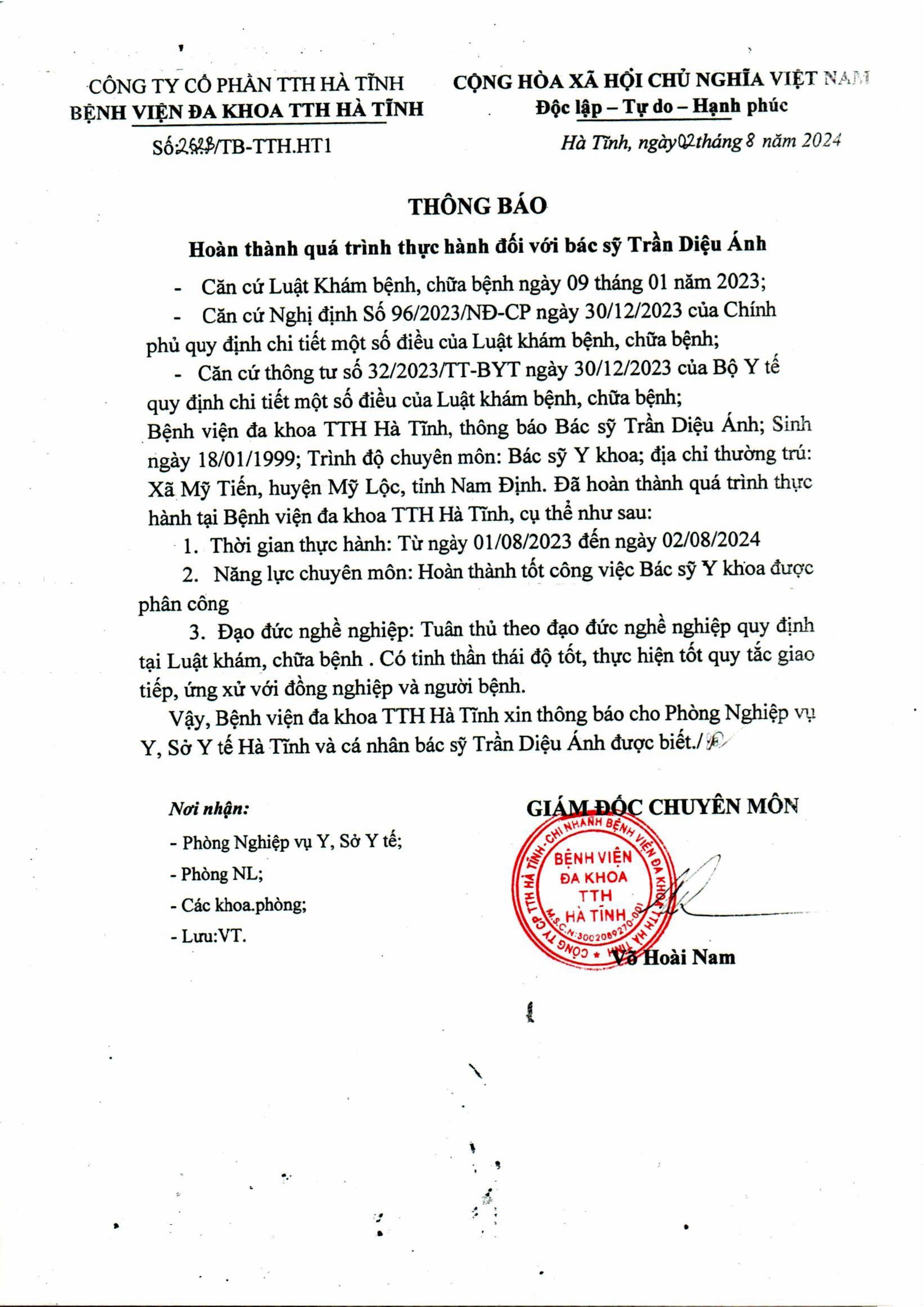 Thông báo hoàn thành quá trình thực hành đối với BS Trần Diệu Ánh