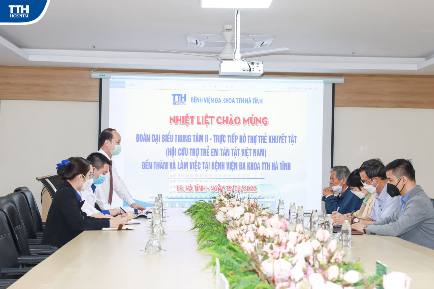 Sáng ngày 16/03/2022, BGĐ Bệnh viện Đa khoa TTH Hà Tĩnh đã làm việc với Đại diện Trung tâm II – Trực tiếp hỗ trợ trẻ khuyết tật (Thuộc Hội cứu trợ trẻ em tàn tật Việt Nam), nhằm thống nhất kế hoạch, phối hợp triển khai chương trình "Khám và phẫu thuật cho trẻ em khuyết tật trên địa bàn tỉnh Hà Tĩnh"